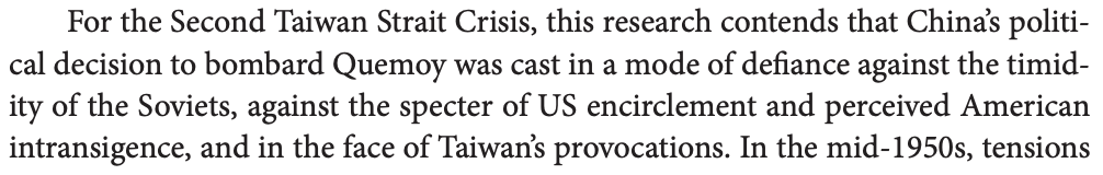 - Mao made a political decision to move against Taiwan as he saw the Soviets as weak. It showed CCP power at a time when Sino-Soviet relations were deteriorating.